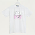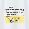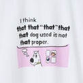 "that" の使い方を考える犬をデザインしたTシャツです。いろんな品詞として使われる"that"。「あの犬が使ったあの"that" は…」と考えを巡らす、かわいい犬に注目!